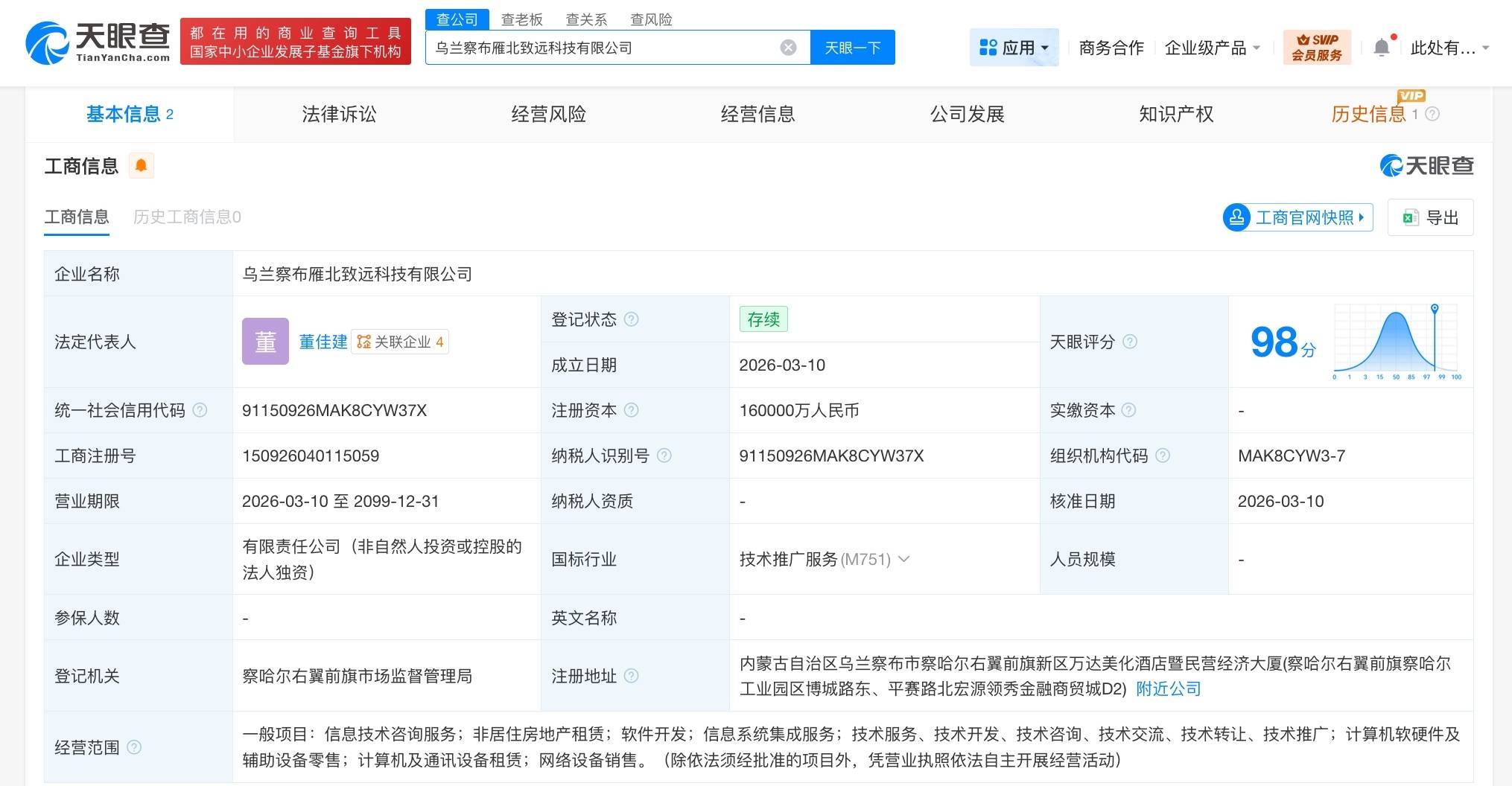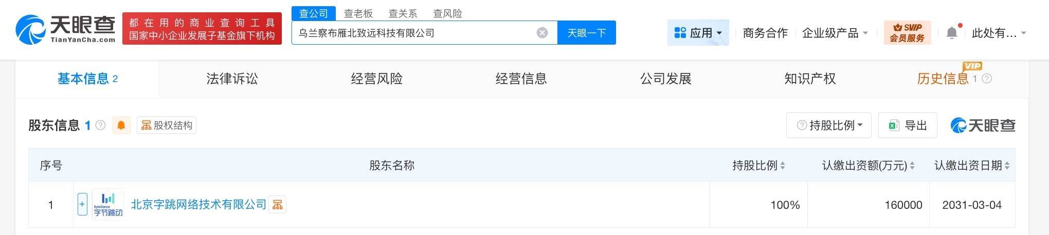 南方财经3月13日电,天眼查工商信息显示,近日,乌兰察布雁北致远科技有限公司成立,法定代表人为董佳建,注册资本16亿人民币,经营范围包括信息技术咨询服务、软件开发、信息系统集成服务等。股东信息显示,该公司由字节跳动旗下北京字跳网络技术有限公司全资持股。